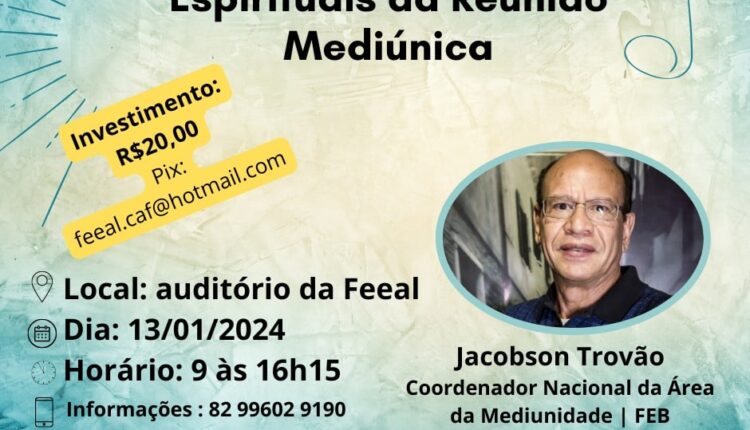 Vários subtemas relacionados serão apresentados por nossos expositores em sete casas espíritas, além da FEEAL,  e no dia 13, sábado, das 9h às 16h15, a programação incluirá o seminário ‘Dimensões Espirituais da Reunião Mediúnicas’ com Jacobson Trovão, coordenador nacional da Área de Mediunidade da FEB.