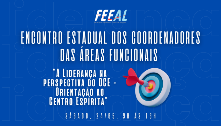 O Colegiado Diretor da FEEAL convida dirigentes e coordenadores para o ENCONTRO ESTADUAL DOS COORDENADORES DAS ÁREAS FUNCIONAIS, que terá como tema central: “A Liderança na perspectiva do OCE – Orientação ao Centro Espírita”.