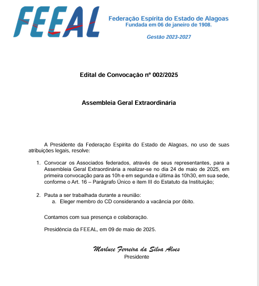 DestaquesMovimento EspíritaNotícias Edital de Convocação nº 002/2025 Assembleia Geral Extraordinária Atualizado em 10 de dezembro de 2025 883 Compartilhar